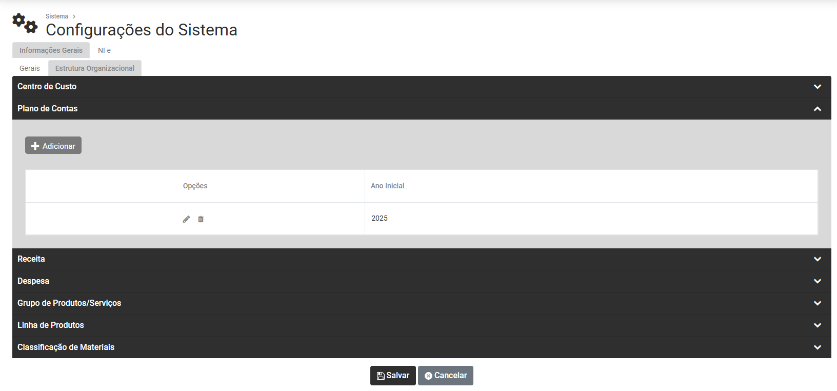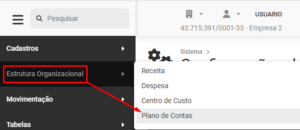 Em seguida acesse Estrutura Organizacional>Plano de Contas