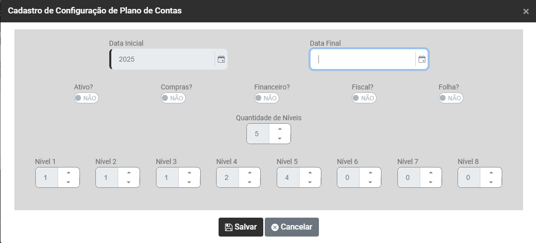 - Quantidade de Caracteres para cada Nível do Plano de Contas