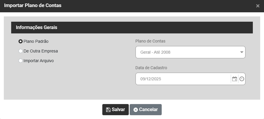 - Plano Padrão - Será copiado o Plano de Contas internamente cadastrado pelo Sistema - informe Qual será o plano de contas e a data de cadastro (lembrando que a utilização do plano de contas só será possível depois da data informada)