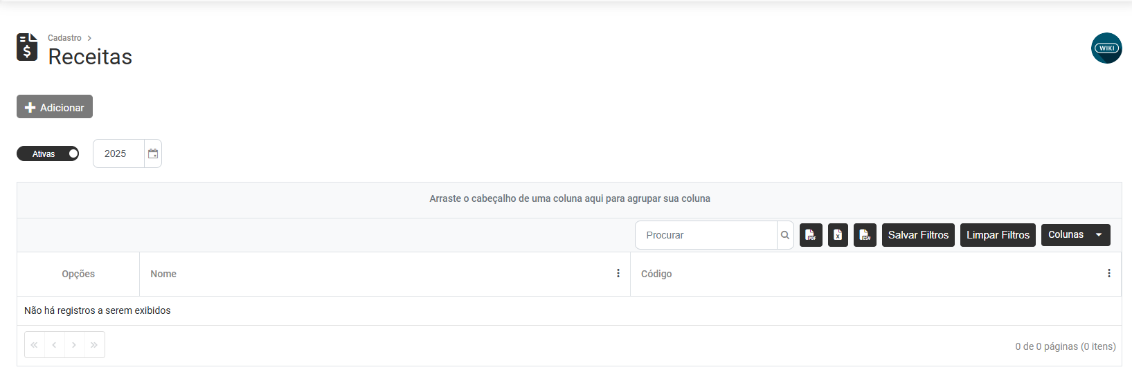 Ao clicar no botão Adicionar será aberta a tela para cadastro das Recitas, informe: