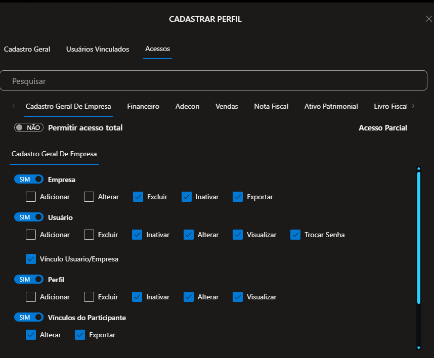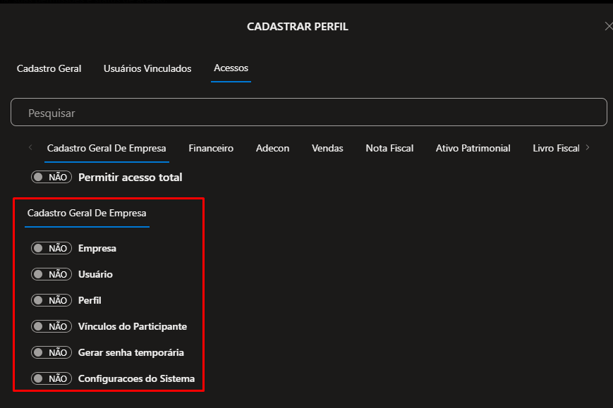 2.2.1) Cadastro Geral de Empresa, defina se o Usuário que estiver vinculado a esse perfil terá direito de:
