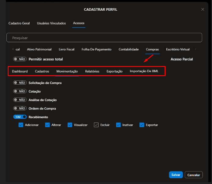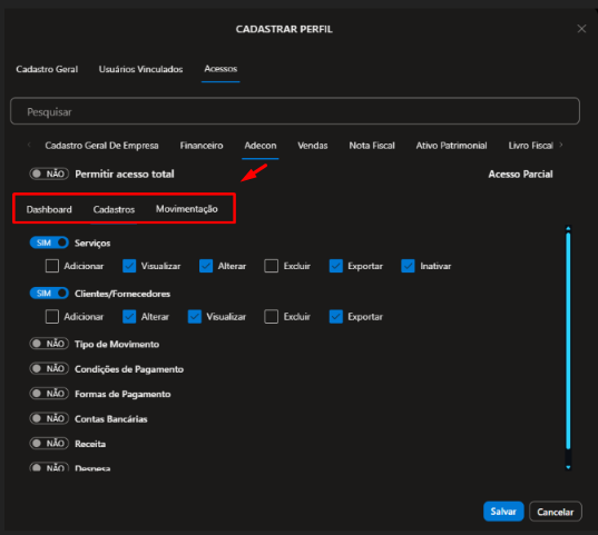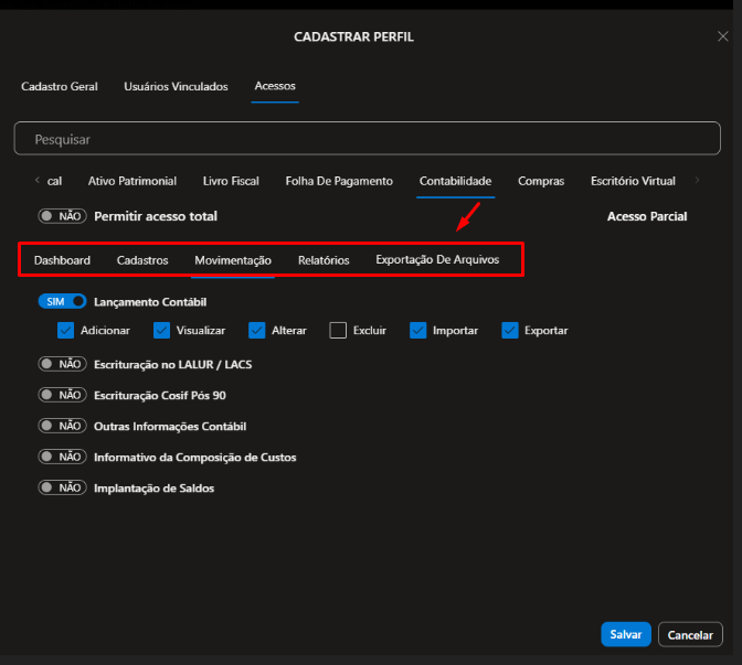 2.2.9) Contabilidade, defina se o Usuário que estiver vinculado a esse perfil terá direito de: