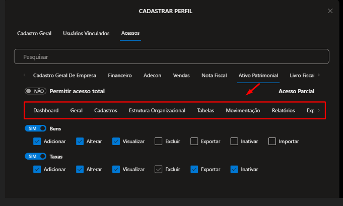 2.2.6) Ativo Patrimonial, defina se o Usuário que estiver vinculado a esse perfil terá direito de: