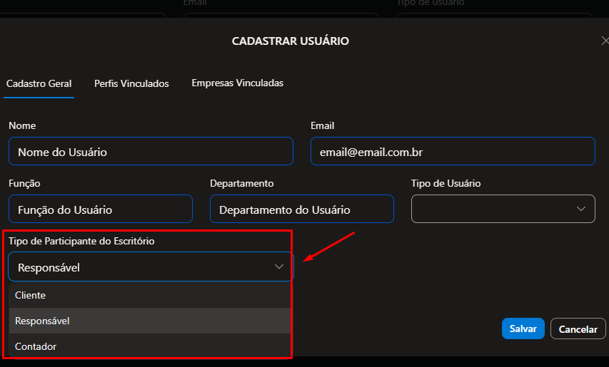 a) Cliente - Deverá ser utilizado quando você cadastrar um Cliente do Escritório Contábil (esse tipo de participante tem restrições na utilização do Módulo Escritório Virtual, podendo acessar apenas o Dashboard do mesmo e os Atendimentos vinculados a ele)