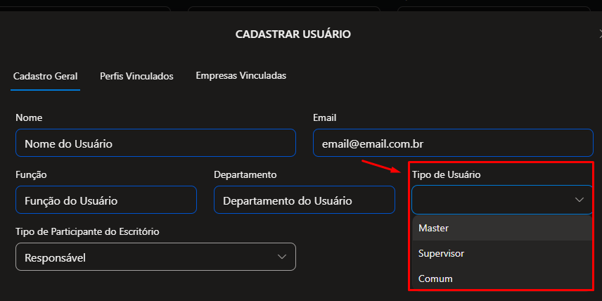 c) Comum - Geralmente utilizado quando você está cadastrando O CLIENTE DO ESCRITÓRIO CONTÁBIL que também conseguirá acessar o seu Escritório Contábil (podendo visualizar o Dashboard do mesmo e os Atendimentos vinculados a ele)