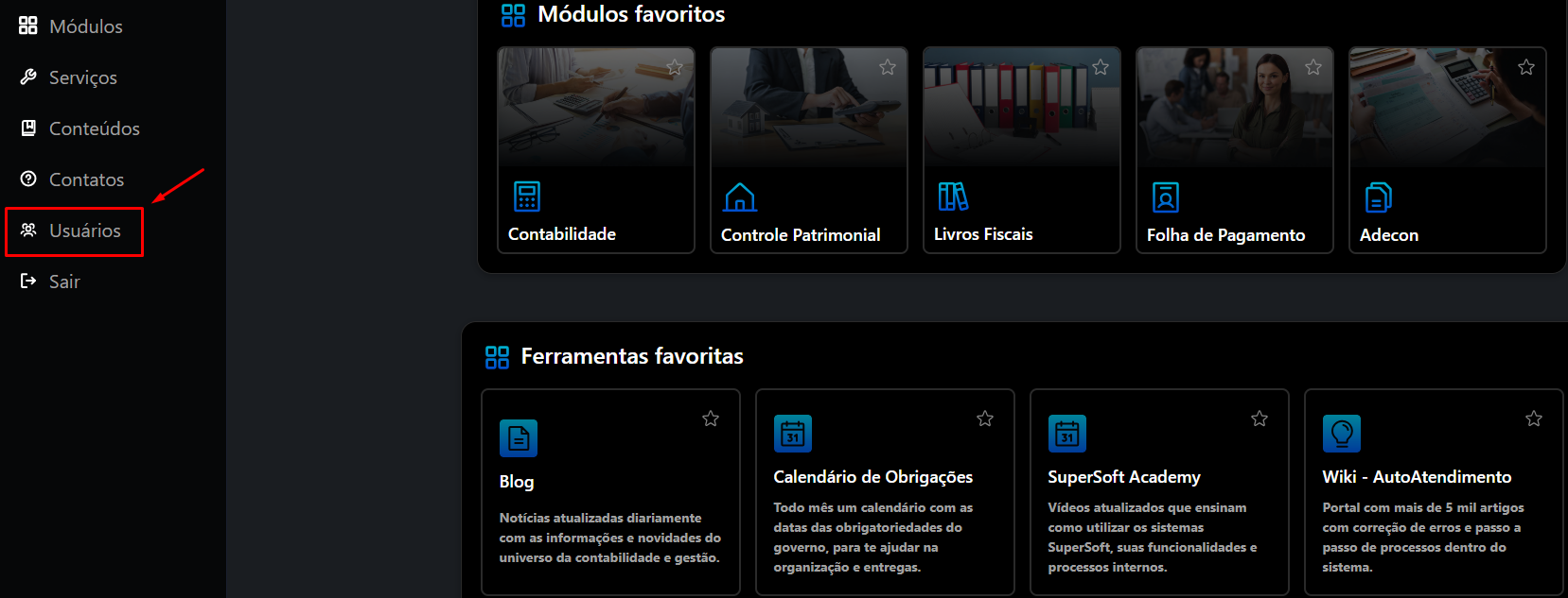Para o cadastro e definição dos direitos dos usuários você deverá clicar no menu Usuários