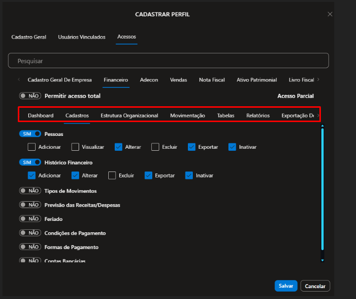 2.2.2) Financeiro, defina se o Usuário que estiver vinculado a esse perfil terá direito de: