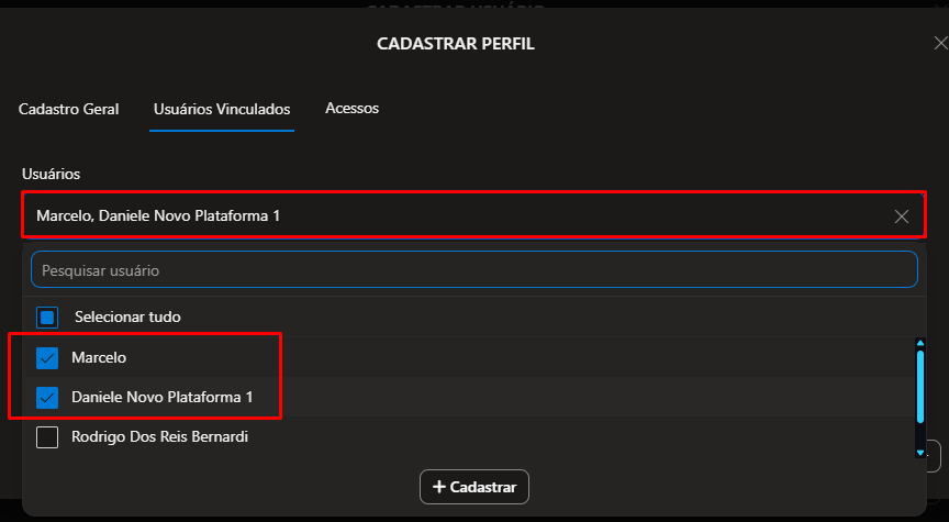 Defina quais são os Usuários Vinculados a esse Perfil (quais são os usuários que terão direito de acesso de acordo com o definido para esse perfil