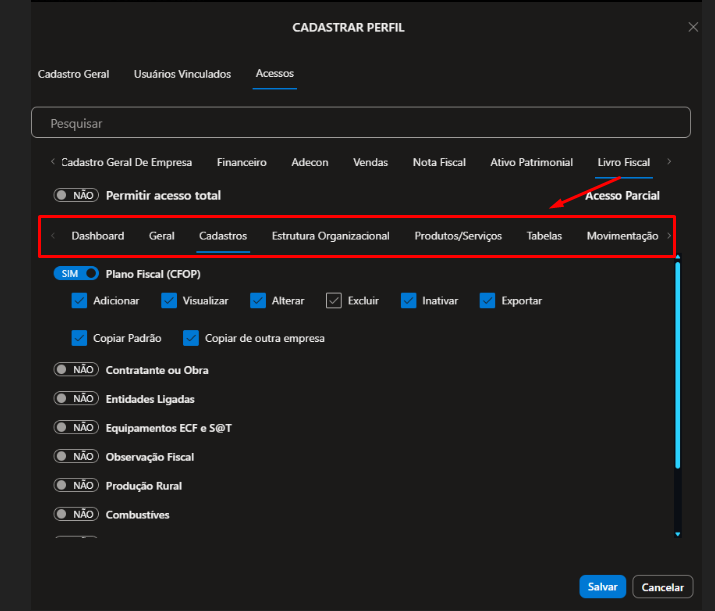 2.2.7) Livro Fiscal, defina se o Usuário que estiver vinculado a esse perfil terá direito de: