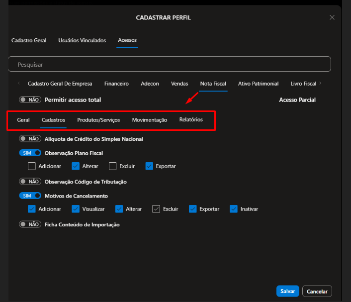 2.2.5) Nota Fiscal, defina se o Usuário que estiver vinculado a esse perfil terá direito de: