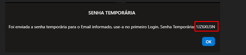 O Sistema apresenta a informação que foi enviada a senha temporária para o email informado (tela acima), use-a no primeiro login e também apresenta qual é a Senha Temporária gerada