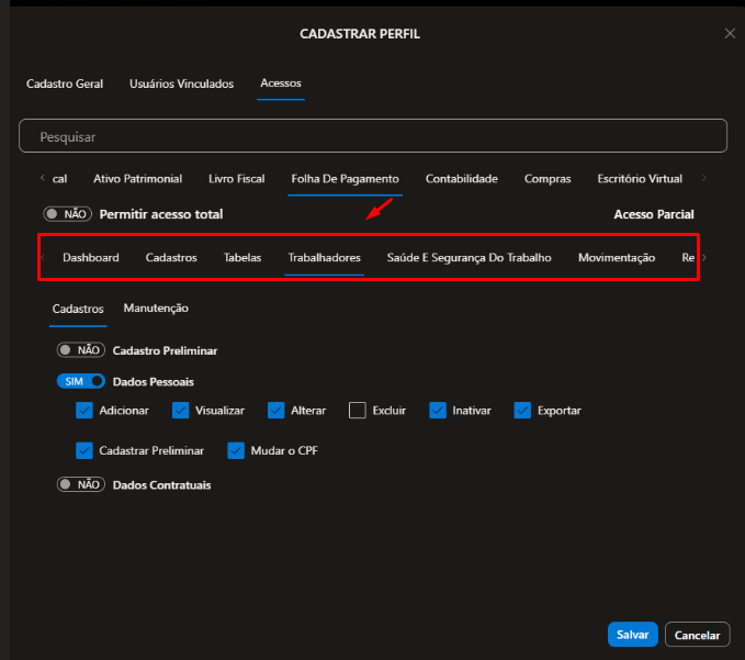 2.2.8) Folha de Pagamento, defina se o Usuário que estiver vinculado a esse perfil terá direito de: