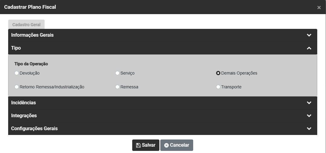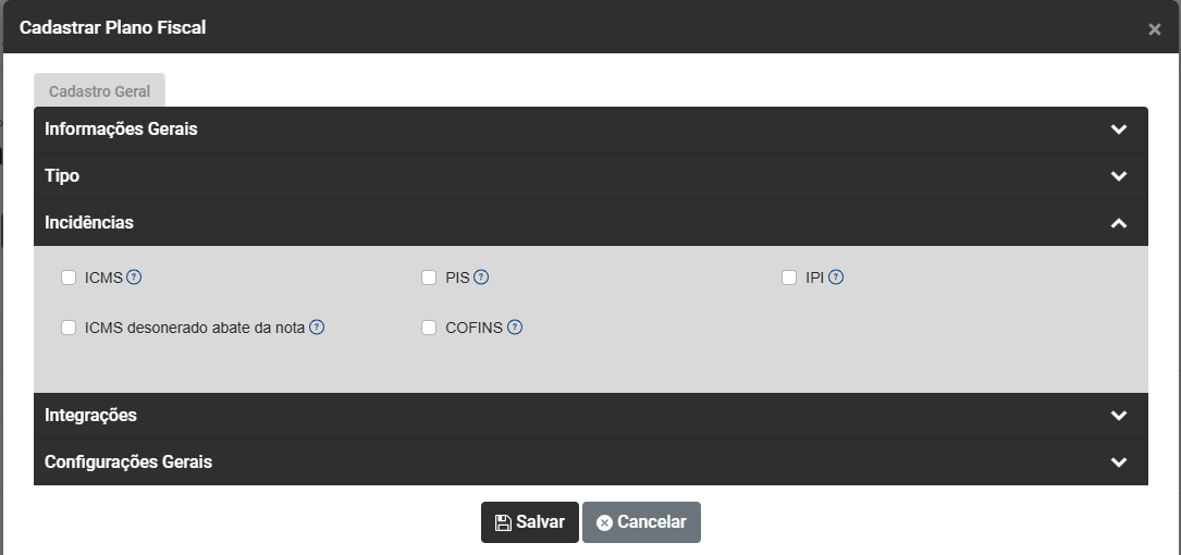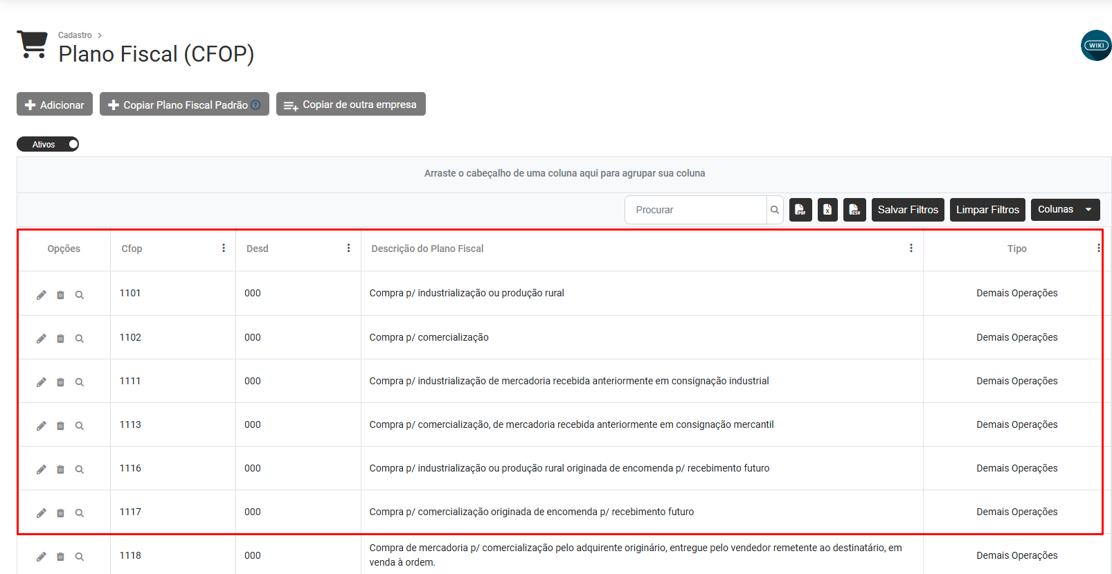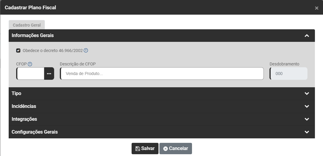 Cadastro do Plano Fiscal (CFOP)