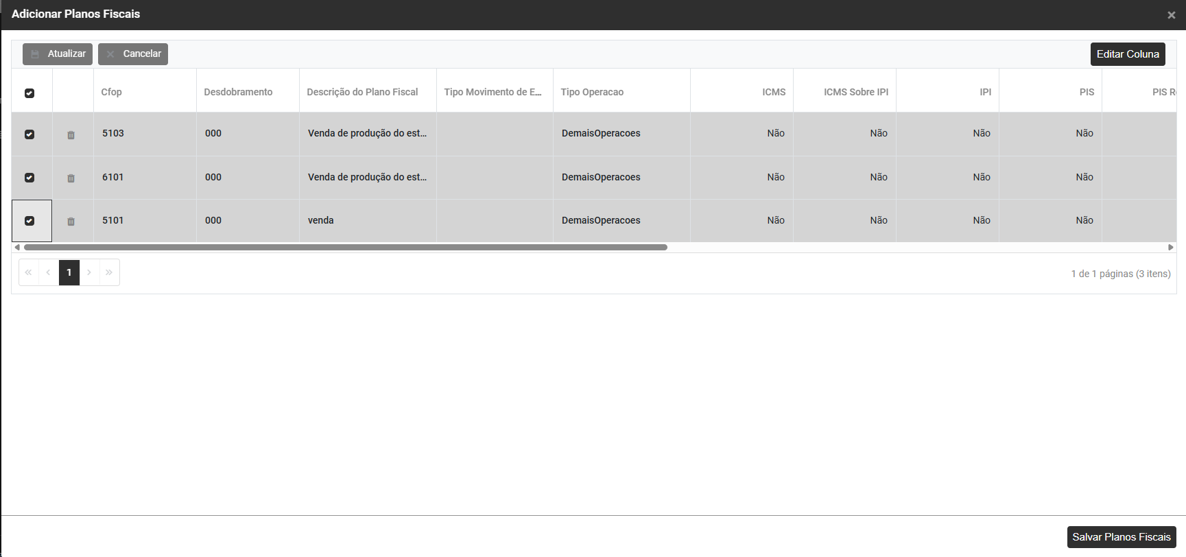 O Sistema irá apresentar a tela para adicionar Planos Fiscais, confira as informações, defina novamente os CFOPs e clique em Salvar Planos Fiscais
