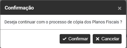Ao acionar o botão será apresentada a mensagem questionando se você Deseja continuar com o processo de cópia dos Planos Fiscais, clique em confirmar