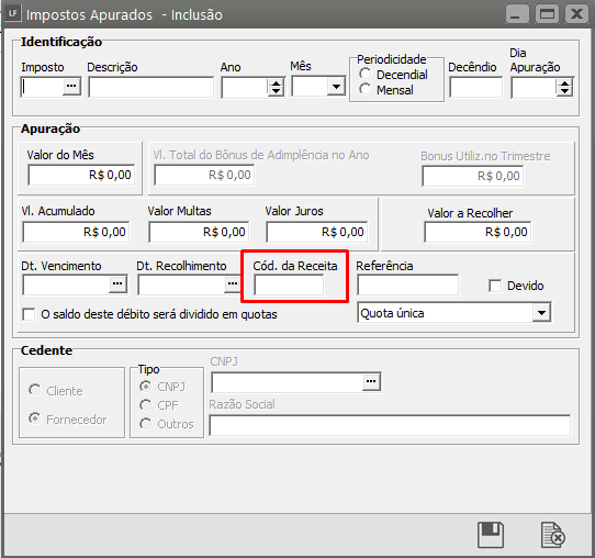 Abra a linha da apuração do período em questão e verifique o código informado no campo "Cód. da Receita" está correto, com seu devido 'hífen' incluído.