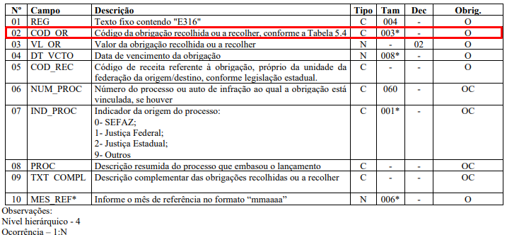 Bloco E316 - Campo obrigatório. (Campo 2 - COD_OR)