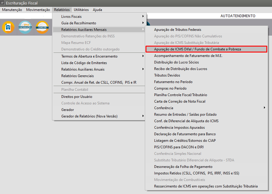 Correção: Acesse o menu Relatórios > Relatórios Auxiliares Mensais > Apuração de ICMS Difal / Fundo de Combate a Pobreza