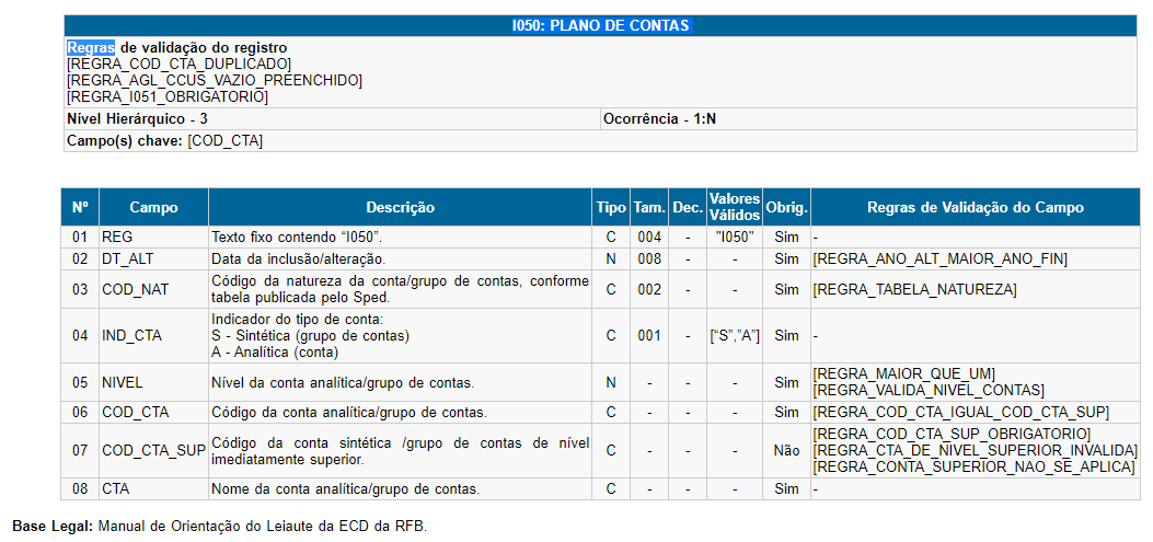 - I050: Plano de Contas.