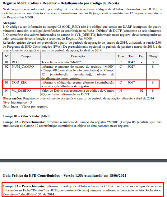 Bloco M605 - O valor informado deverá existir na Tabela 4.4.1 - Códigos de Receitas de PIS/Pasep (para PIS/Pasep) ou 4.4.2 - Códigos de Receitas de Cofins (para Cofins). (Campo COD_REC)