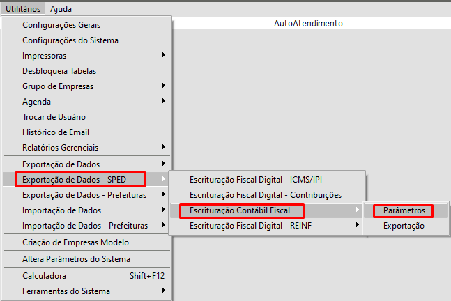 2 - No Sistema Livros Fiscais, acesse o menu Utilitários>Exportação de Dados SPED>Escrituração Contábil Fiscal>Parâmetros