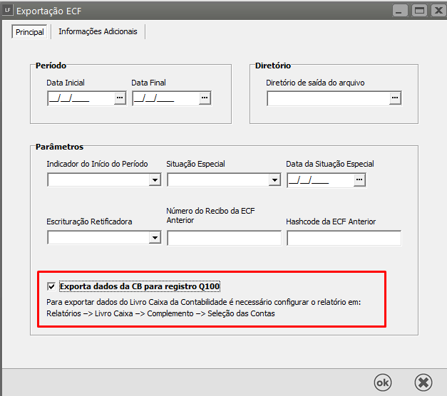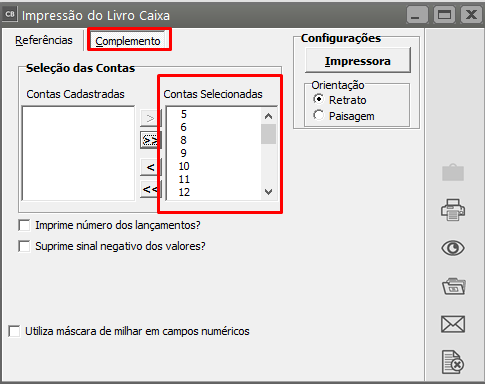 Acessar o Sistema de Contabilidade, no menu Relatórios>Livro Caixa>Aba "Complemento" e selecione as contas que serão levadas para o arquivo.