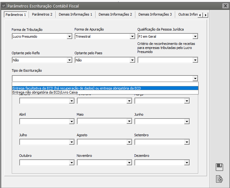 Na aba Parâmetros 1, definir corretamente o Tipo de Escrituração