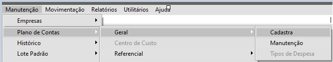 Em caso negativo, faça o cadastro do Plano de Contas acessando o menu Manutenção > Plano de Contas > Geral > Cadastra