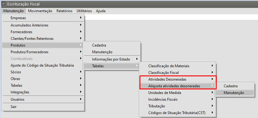 Correção: Acesse o menu Manutenção > Produtos > Tabelas > Atividades Desoneradas e Alíquotas Atividades Desoneradas > Manutenção