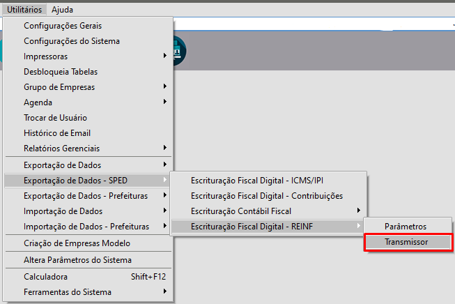 Agora, para realizar os envios, acesse o menu Utilitários > Exportação de Dados - SPED > Escrituração Fiscal Digital - REINF > Transmissor: