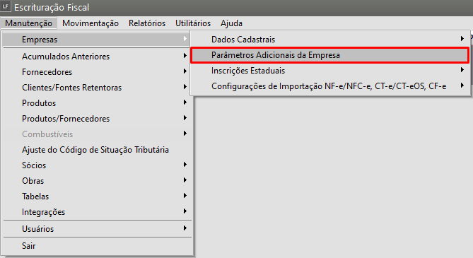 Correção: Acesse o menu Manutenção > Empresas > Parâmetros Adicionais da empresa.