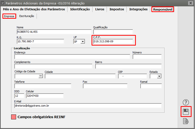 Verifique se o CPF indicado na aba Responsável > Empresa, está indicado corretamente ou se está sem preenchimento.