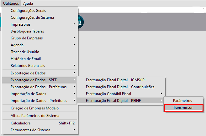 Após correção e/ou preenchimento, acesse o menu Utilitários > Exportação de Dados - SPED > Escrituração Fiscaç Digital - REINF > Transmissor