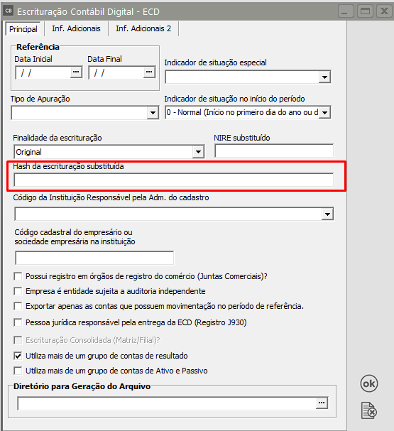 Acessar o menu Utilitários > Exportação de Dados > Escrituração Contábil Digital - ECD, e informar corretamente o campo Hash da escrituração substituída.