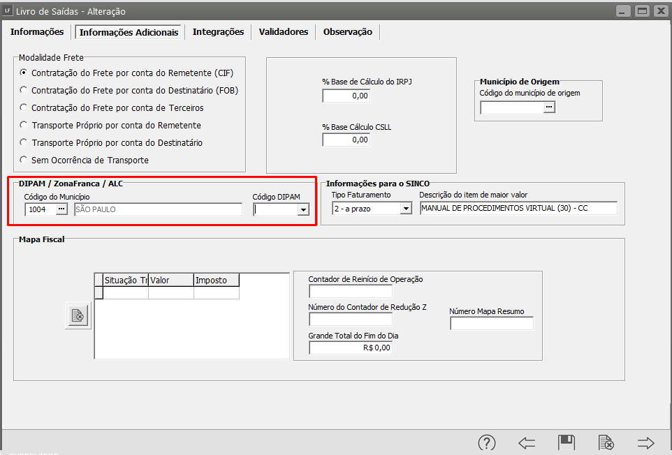 Escrituração do Livro de Saídas edite as notas e verifique se na aba Informações Adicionais, o campo DIPAM está corretamente preenchido.