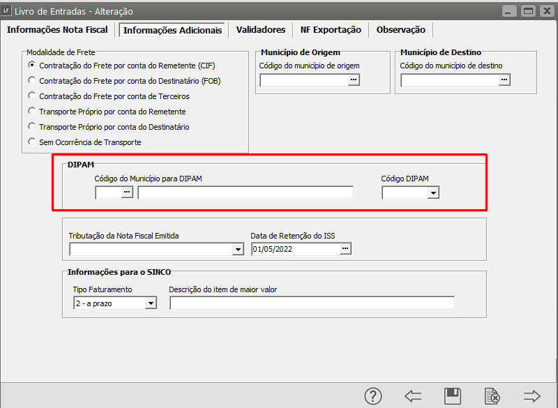 Escrituração do Livro de Entrada, edite as notas e verifique se na aba Informações Adicionais, o campo DIPAM está corretamente preenchido.
